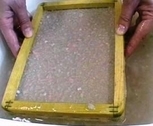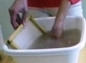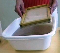 5. Mõlemad raamid viiakse koos vette, liigutatakse edasi-tagasi ja tõstetakse pabermassiga koos kausist välja ja nõrutatakse.