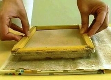 6. Piiramisraam eemaldatakse ja paberiga raam keeratakse ettevaatlikult riidetükile või ajalehele nii et pabermass jääb allapoole ning tupsutatakse švammiga võimalikult kuivaks. | ![]() |