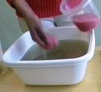 3. Suurem kauss või muu nõu täidetakse poolenisti veega ja sinna sisse valatakse osa paberimassist (mida paksemat paberit saada tahetakse, seda rohkem massi tuleb panna). | ![]() |